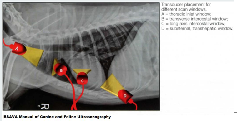 The transducer is close to the sternum in cats but further away in larger dogs.