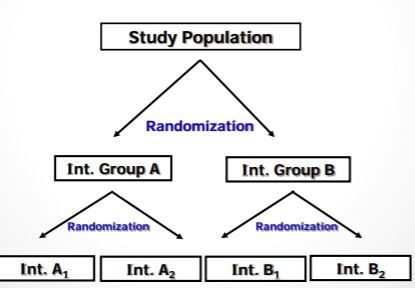 Randomizes subjects into two grpups and then a second level of randomization into additional subgroups