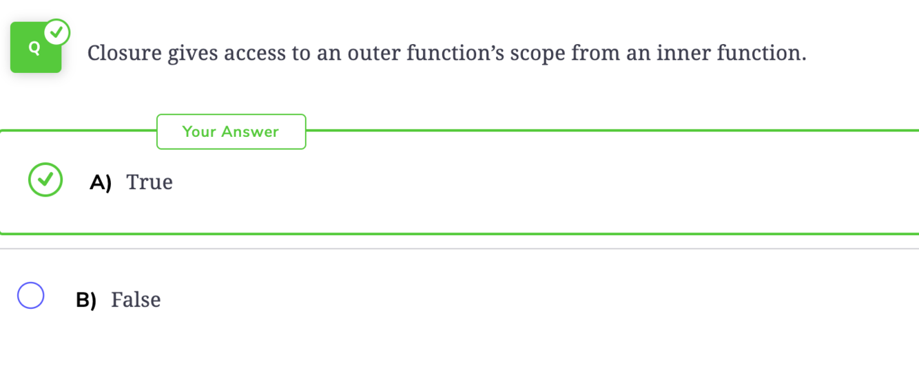 In JavaScript, a closure is a function that can access the variables from another function’s scope. This is possible by creating nested functions. The enclosing/outer function will, however, not have access to the inner scope.