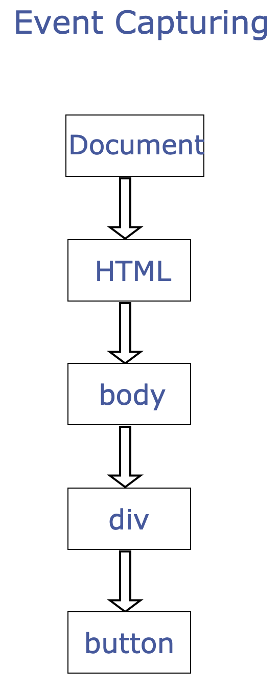 In event capturing, when you click the button, the event passes from the parent down to the event target,