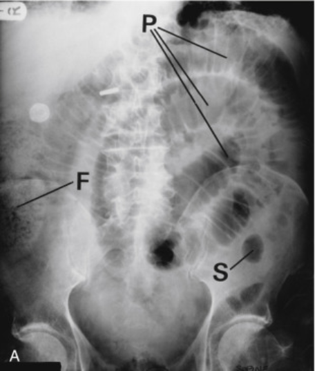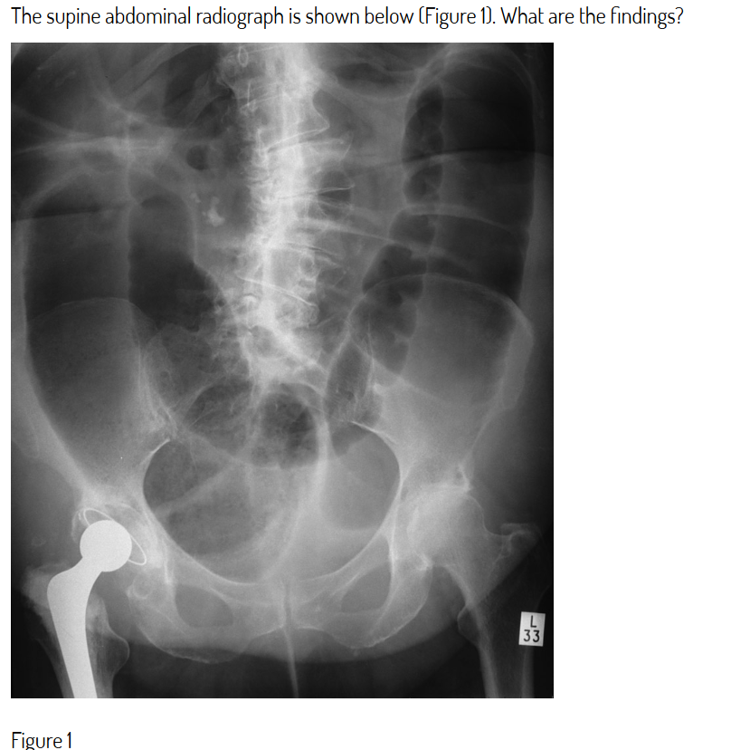 The large bowel is dilated – note haustrations to identify and peripheral distribution. There is no gas in the rectum making pseudo-obstruction unlikely. No thumb-printing is evident to suggest ischaemia. Note also right hip replacement.