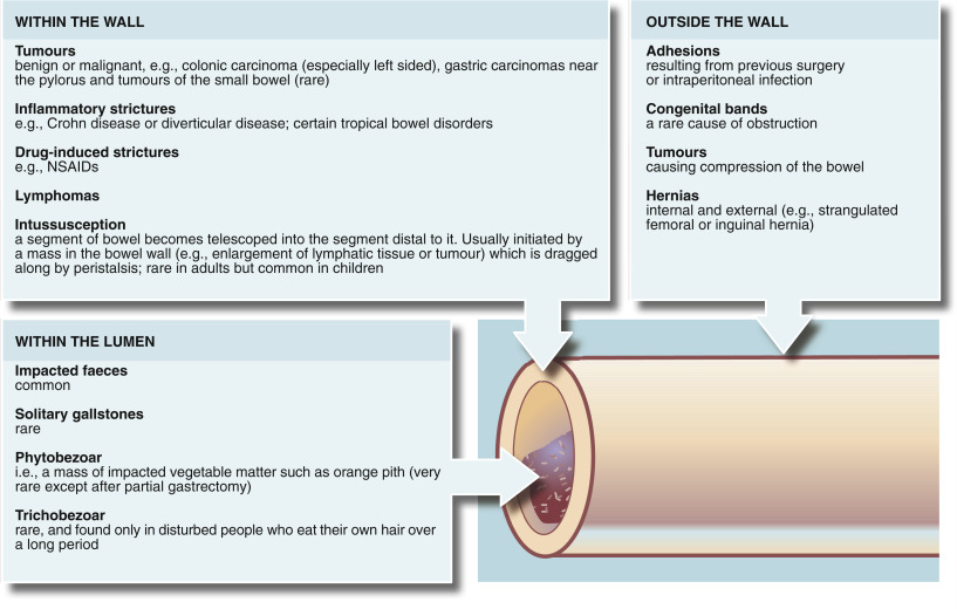Name 3 causes of bowel obstruction.