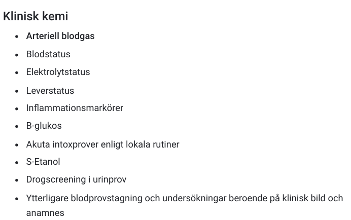 Prover -> ABG, blodstatus, elstatus, leverstatus, inflammation, B-glukos, akuta intoxpriver enligt lokala rutiner, S-etanol, drogscreening i urin