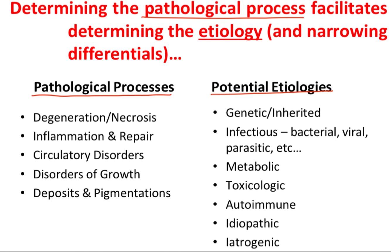 Describe pathological processes VS potential etiologies.