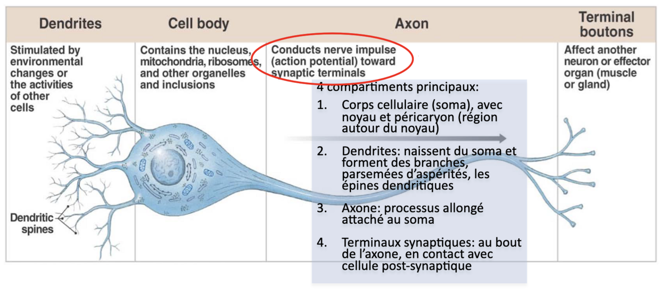 Quels sont les 4 compartiments structuraux d’un neurone?