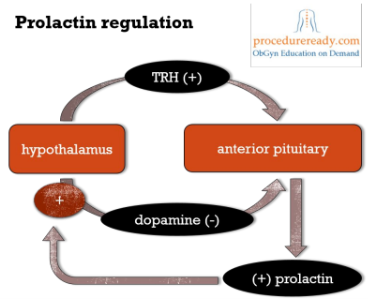 Dopamine, released from the hypothalamus inhibits the secretion of prolactin from the anterior pituitary