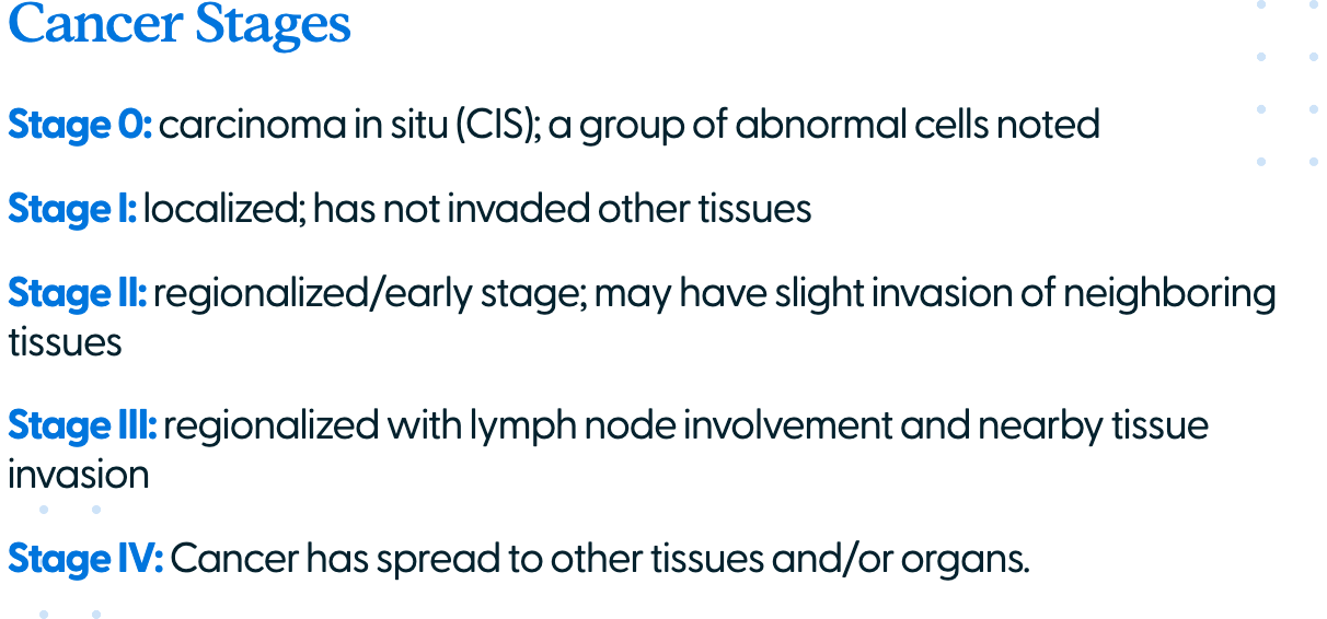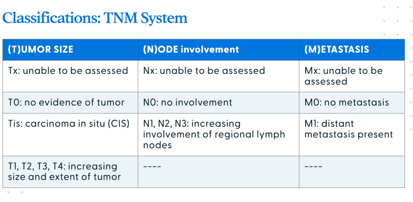 used for solid masses; describes primary (T)umor, spread to (L)ymph nodes, and (M)etastasis; most widely used system; includes numbers to indicate increasing levels of each letter
