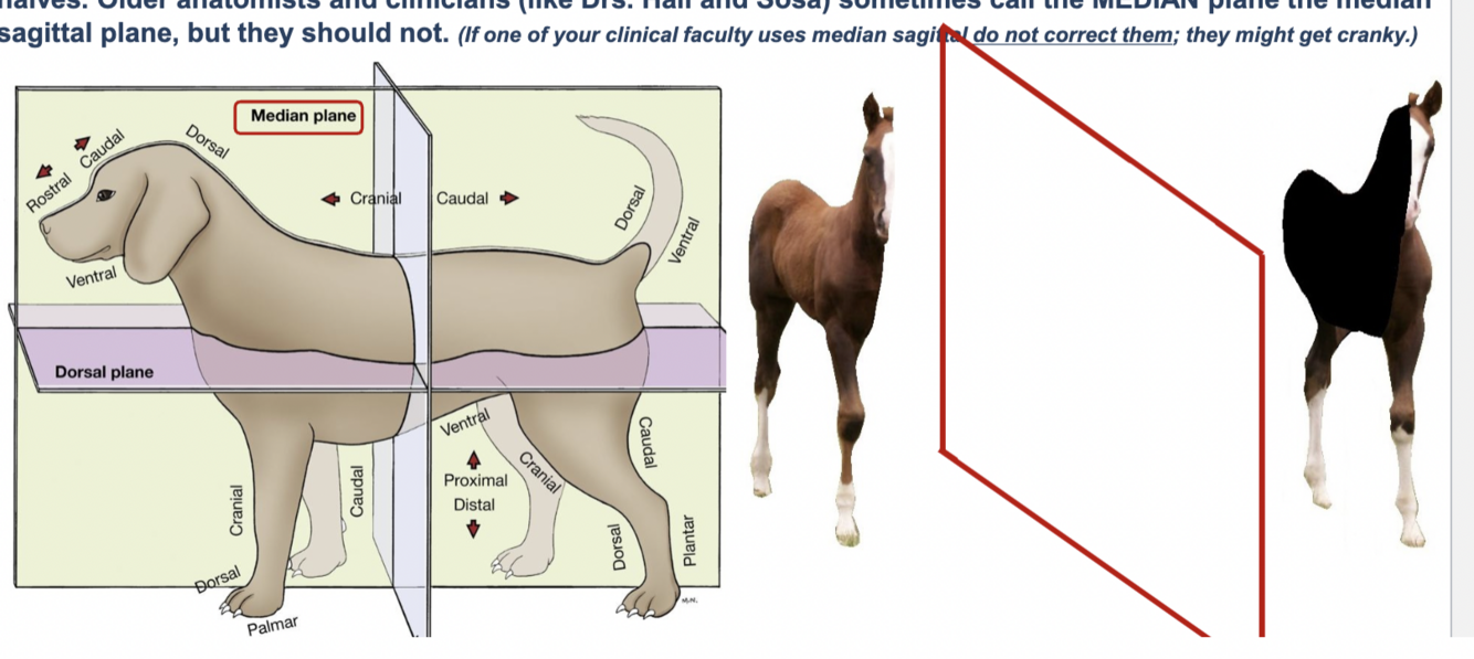 the _____ plane is one, unique, longitudinal plane dividing the animal into (imaginary) perfect right and left halves