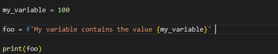 Write a piece of code using f string that stores my_variable with 100, has variable foo with f string saying my variable contains value of 100 and print it