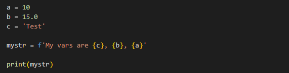 Have a f string stored in variable ‘mystr’ which says ‘My vars are and prints values of c,b,a