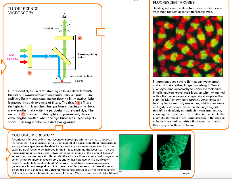 Fluorescent dyes absorb light at one wavelength and emit it at a longer wavelength. Some dyes bind specifically to particular molecules and can reveal their location when viewed with a fluorescence microscope. An example is the stain for DNA. Other dyes can be coupled to antibody molecules, which then serve as highly specific and versatile staining reagents that bind selectively to particular macromolecules, allowing us to see their distribution in the cell. In the example shown, a microtubule protein in the mitotic spindle is stained red with a fluorescent antibody