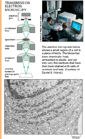 The specimen, which is placed in a vacuum, must be very thin. Contrast is introduced by electron-dense heavy-metal stains that locally absorb or scatter electrons, removing them from the beam as they pass through the specimen.