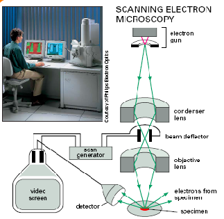 The specimen, which has been coated with a very thin film of heavy metal, is scanned by a beam of electrons brought to a focus on a specimen by the electromagnetic coils that, in electron microscopes, act as lenses. The quantity of electrons scattered or emitted as the beam bombards each successive point on the surface of the specimen is measured by the detector and is used to control the intensity of successive points in an image built up on a screen.