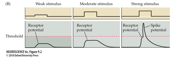Receptors have a certain sensory threshold (which is determined by the sensitivity of the receptors). The intensity of the stimulus determines whether an action potential is triggered.