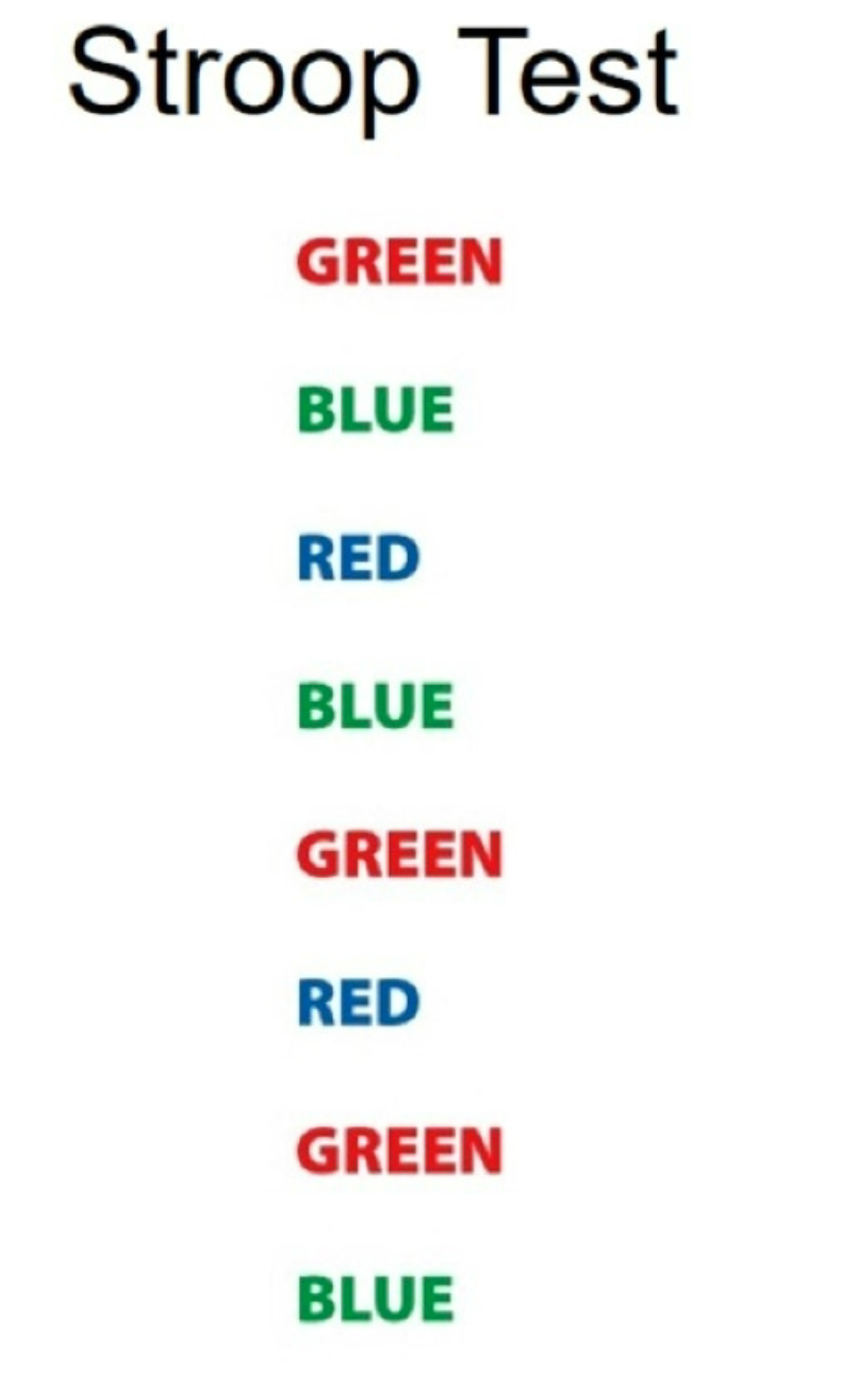The Stroop task present the participant with a list of words and then ask him/her to name the color of each word as fast as possible.