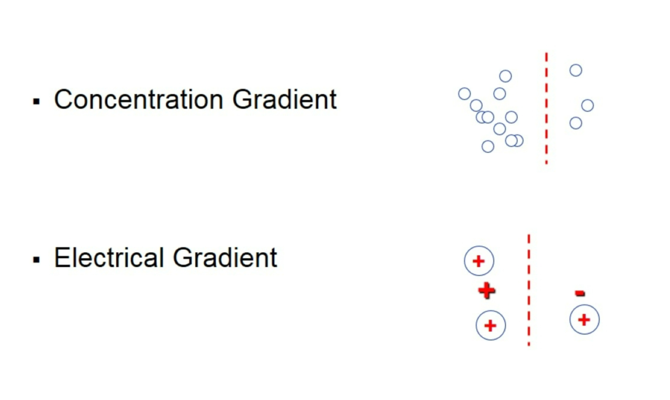 Concentration gradient – ions go from high concentration to low