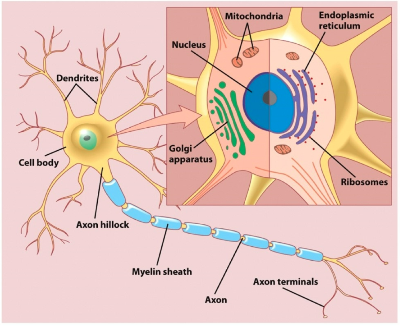 A neuron is composed of three main parts: a cell body, dendrites, and an axon. Like other cells, the neuron contains a nucleus, endoplasmic reticulum, ribosomes, mitochondria, Golgi apparatus, and other intracellular organelles (inset).