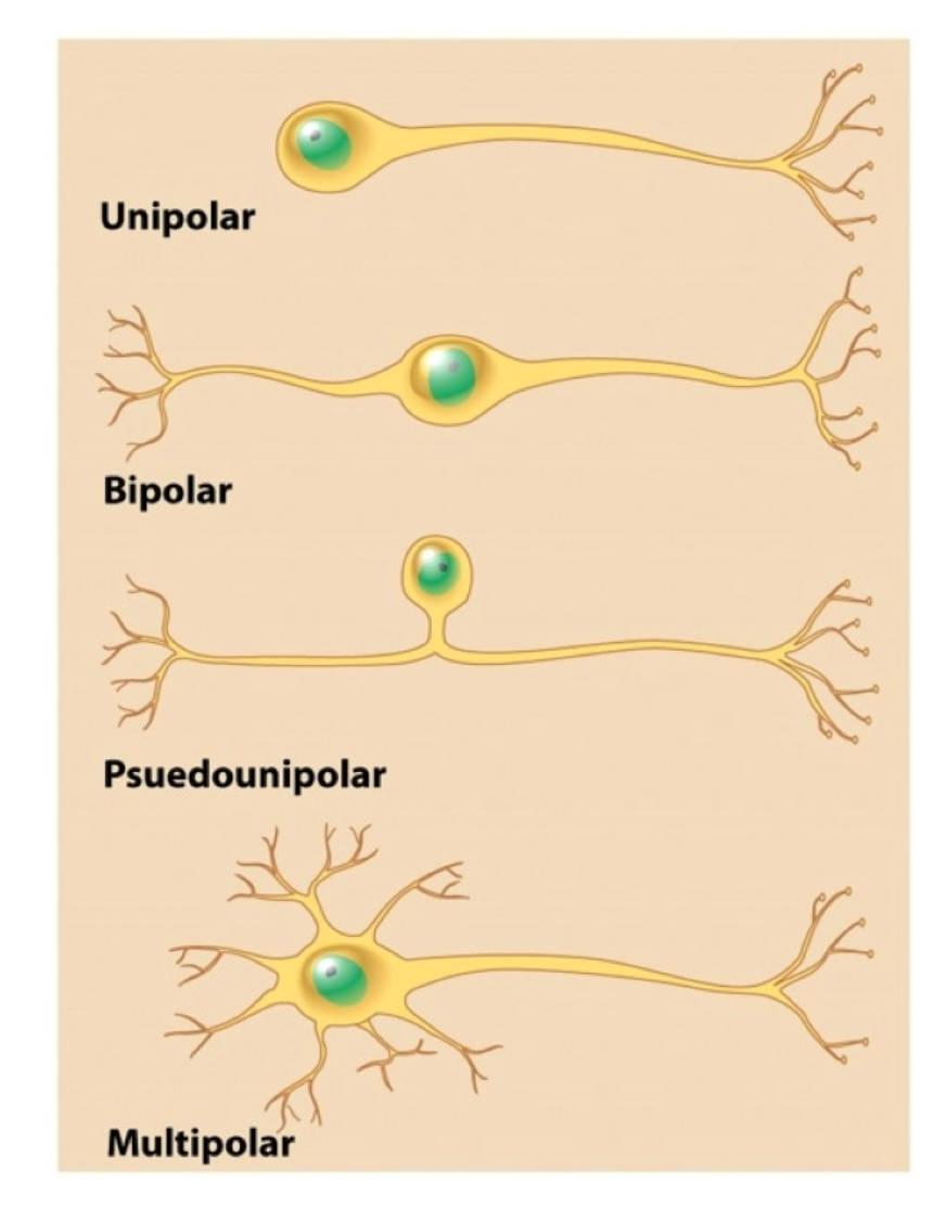Bipolar neurons have one axon and one dendrite extending from the soma. Multipolar neurons contain one axon and many dendrites;