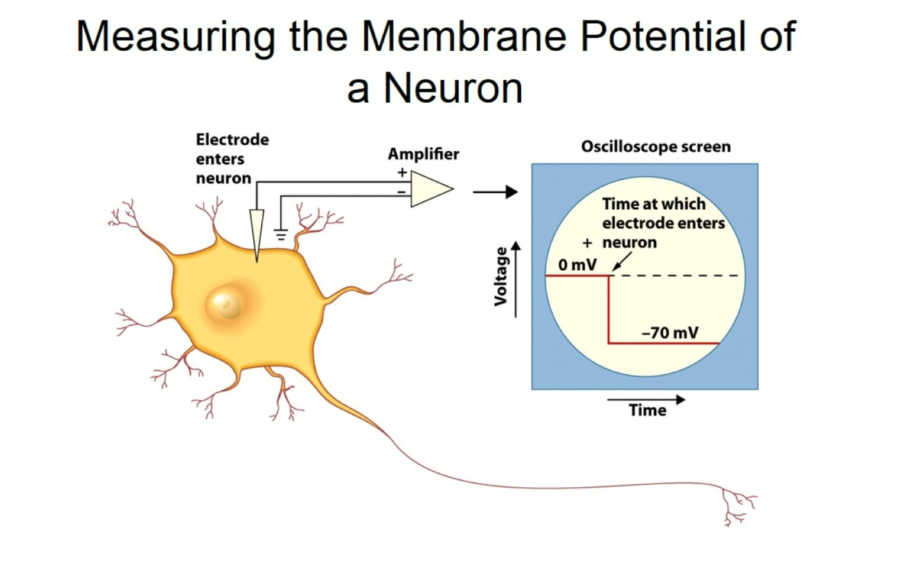 Idealized neuron (left), shown with an intracellular recording electrode penetrating the neuron. The electrode measures the difference between the voltage inside versus outside the neuron, and this difference is amplified and displayed on an oscilloscope screen (top). The oscilloscope screen shows voltage over time. Before the electrode enters the neuron, the voltage difference is zero, but when the electrode is pushed into the neuron, the difference becomes -70 mV, which is the resting membrane potential.