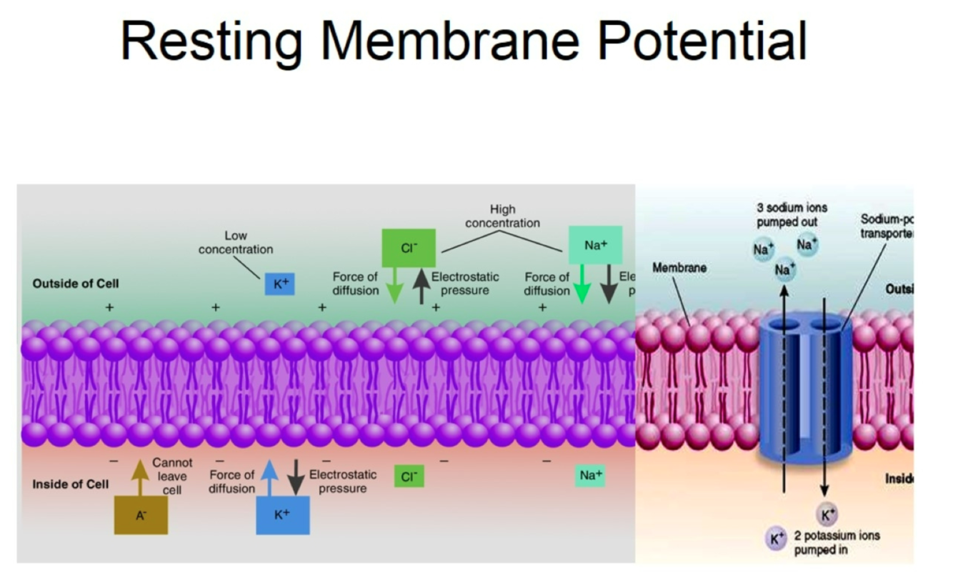 The resting membrane potential arises from the asymmetrical distribution of ions of sodium (Na+), potassium (K+), and chloride (Cl2+) across the neuron’s cell membrane.