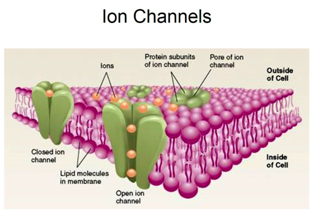 Ion channels are proteins with a pore through the center that allow certain ions to flow down their electrochemical (electrical) and concentration gradients.