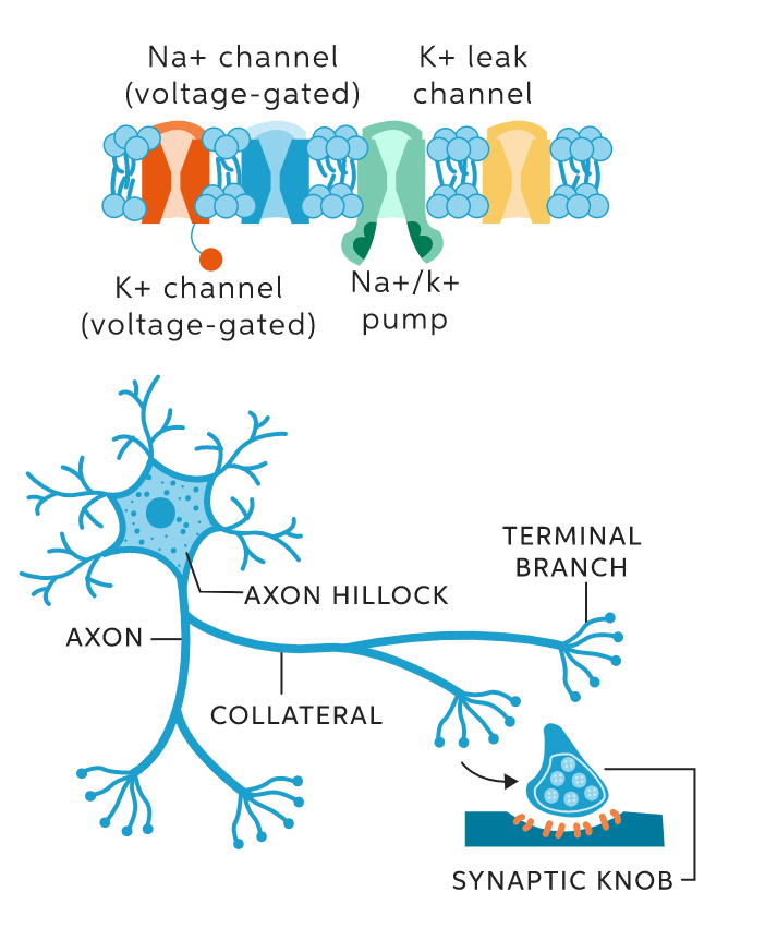 Voltage-gated ion channels are located at the axon hillock of the pre-synaptic neuron, where the action potential is triggered. Ion channels can be found along the whole length of the axon.