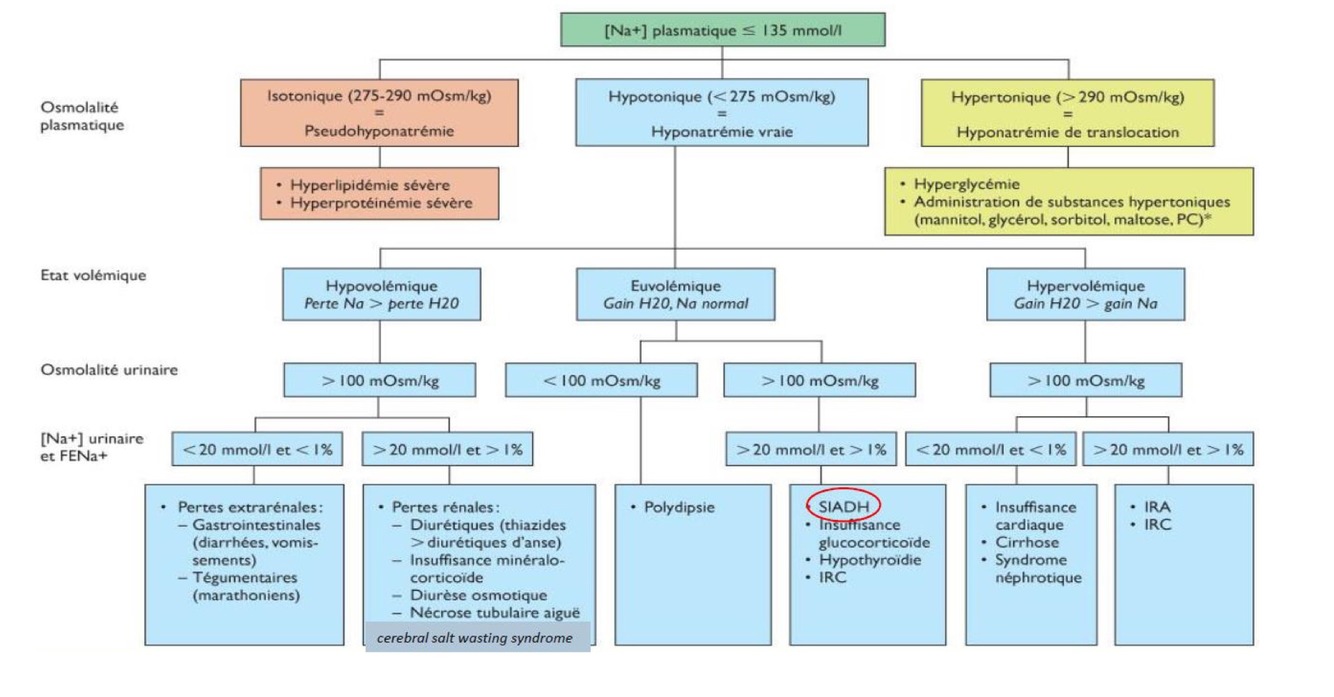 > Dg étiologieque : ATCD (cause svt connue), Osmolalité sanguine (↘ si vraie hypoNa, N ou ↗ si