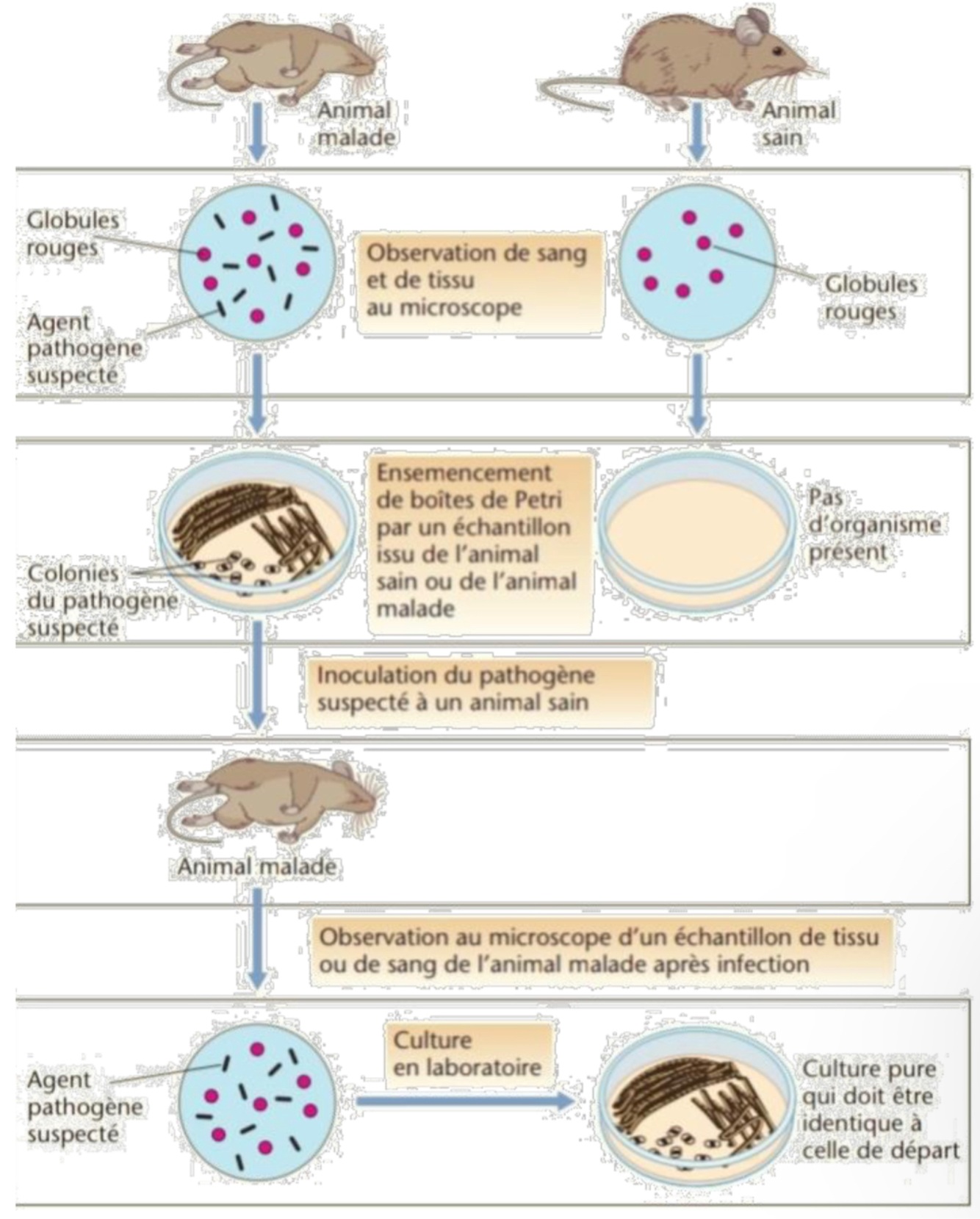 Comparaison entre 2 individus (sain + malade) puis injection chez individu sain d’un pathogène pour démontrer que c’est le même