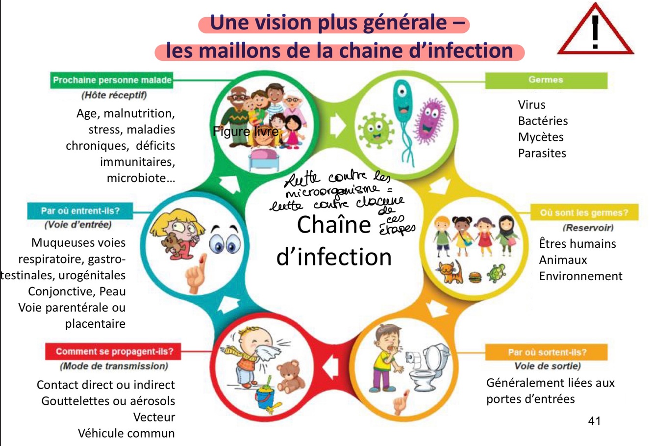Germe —> Réservoir —> Voie de sortie —> Mode de transmission —> Voie d’entrée —> Hôte réceptif —> (cycle recommence)
