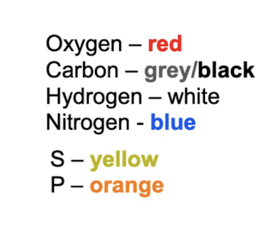 What colours for used for Oxygen, Carbon, Hydrogen, Nitrogen, sulfur,phosphorus