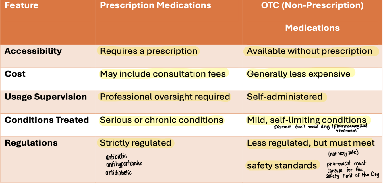 Compare between prescription medications and OTC medications in terms of accessibility, cost, usage supervision, conditions treated, and regulations