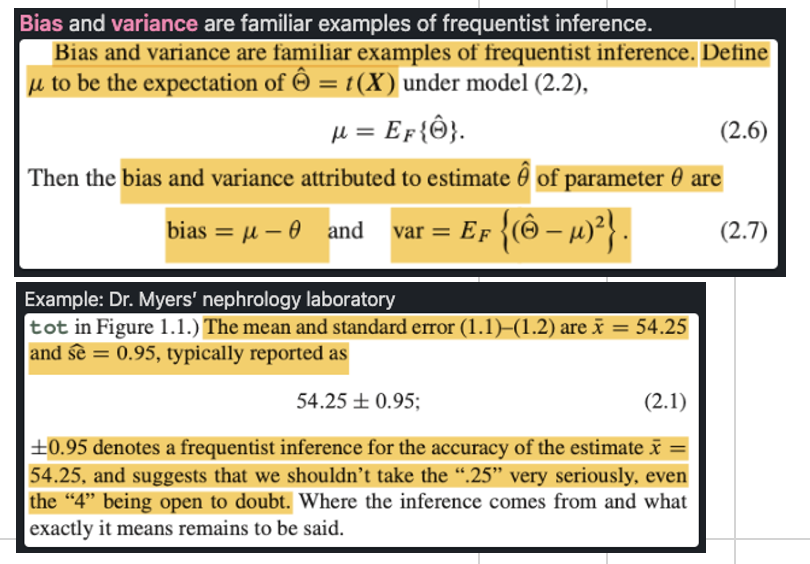 Bias and variance are familiar examples of frequentist inference.