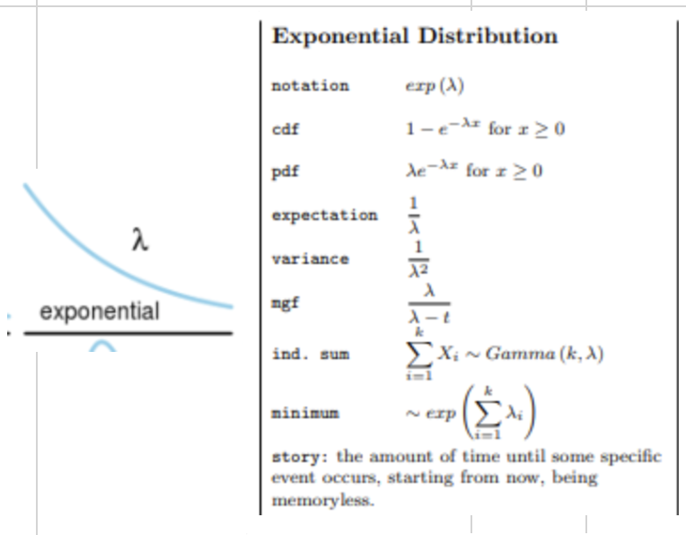 Memoryless property: The probability of an event occurring in the future is independent of past events. Defined by a single parameter: λλ (rate), or alternatively, θ=1/λθ=1/λ (mean).