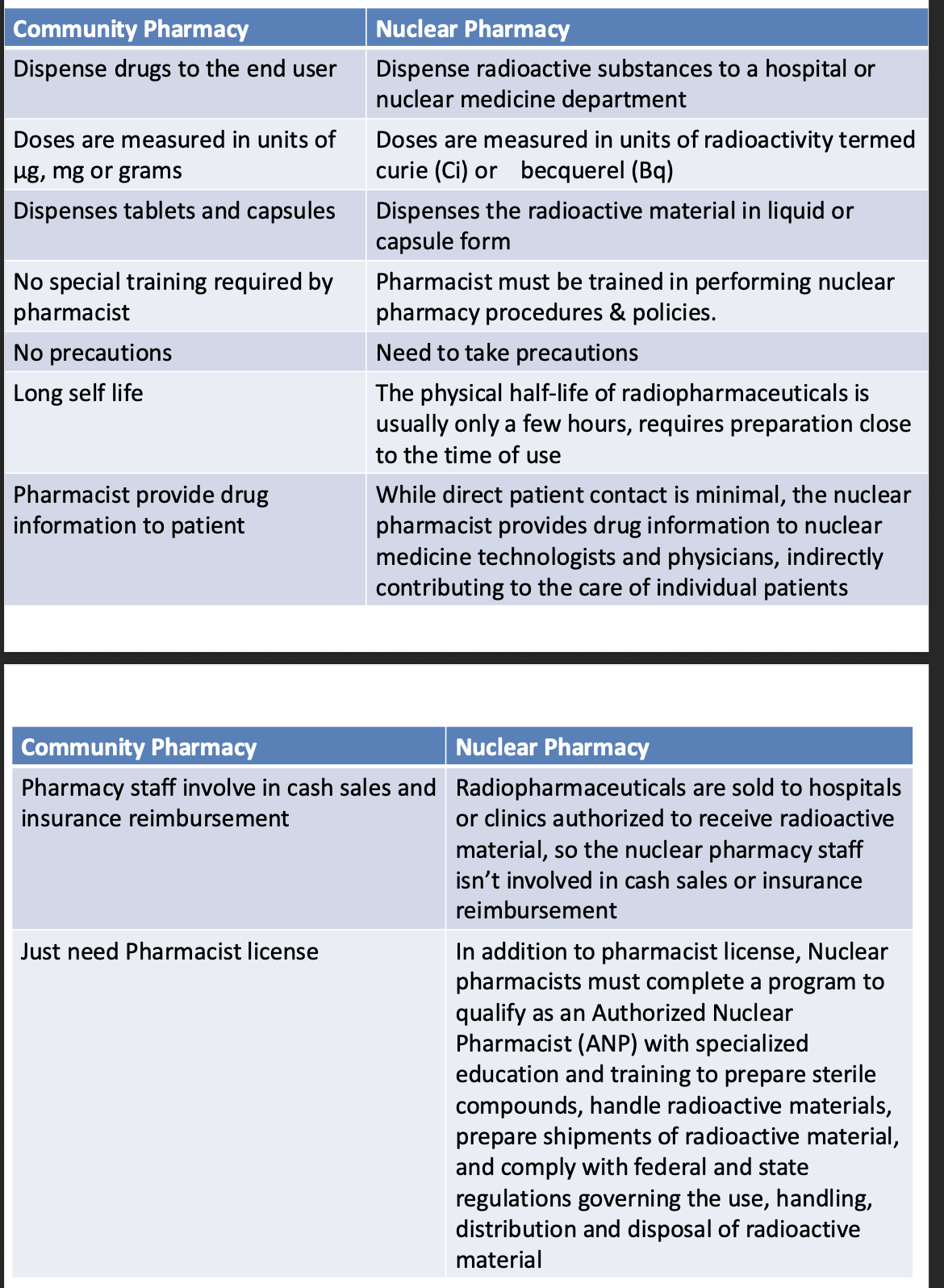 Compare between community and nuclear pharmacy