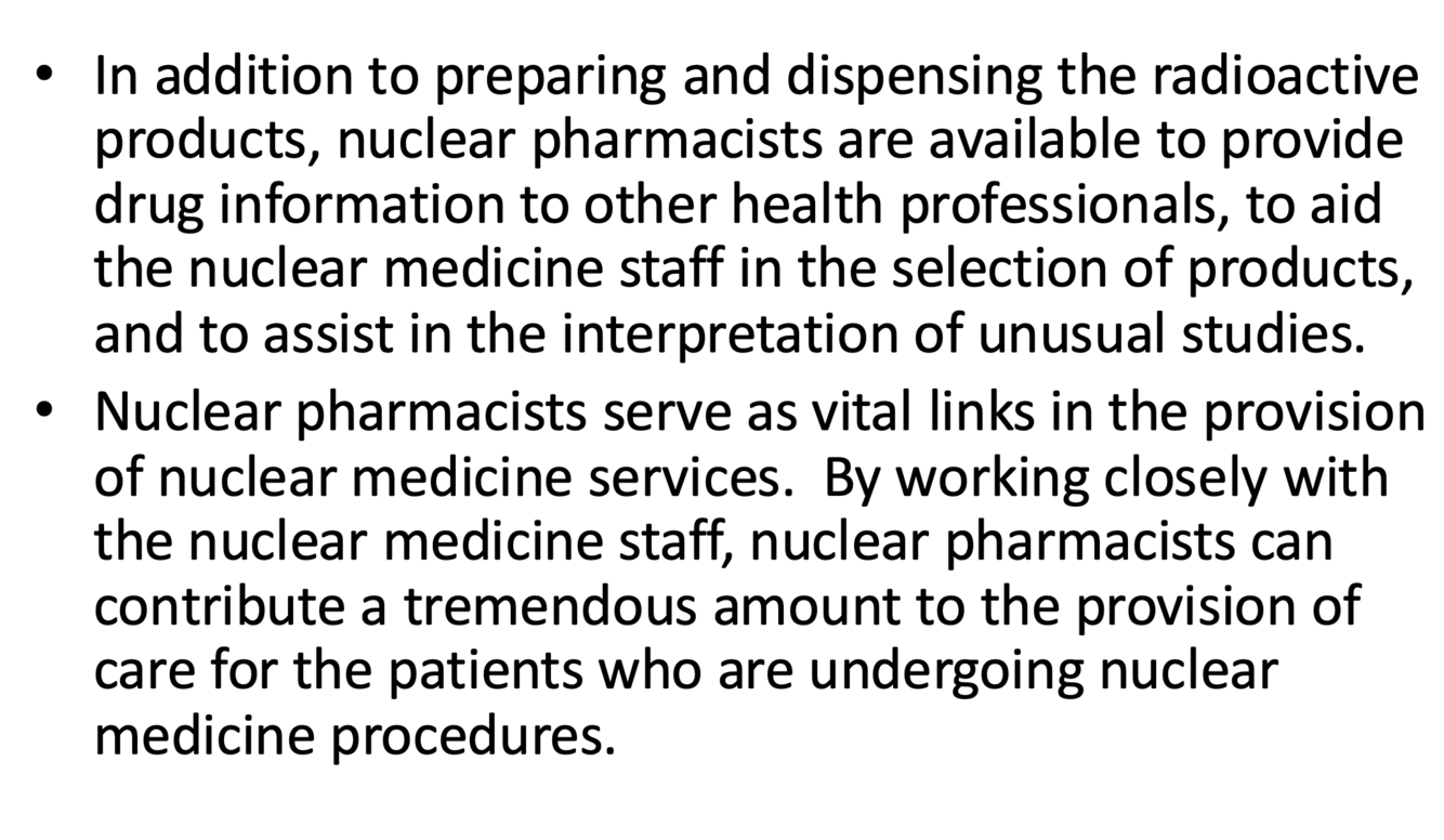 Nuclear pharmacy is a specialty area of pharmacy practice dedicated to the compounding and dispensing of radioactive materials for use in nuclear medicine