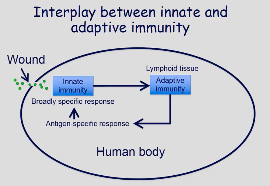 Innate immune response identifies the antigen and tries to contain it. At the same time it talks to the cells in the lymphoid tissue to trigger a highly specific adaptive immune response against the antigen. Once the adaptive immune response is developed it contains the antigen and then it relies on the innate immune response to finish off the pathogen. See the attached slide