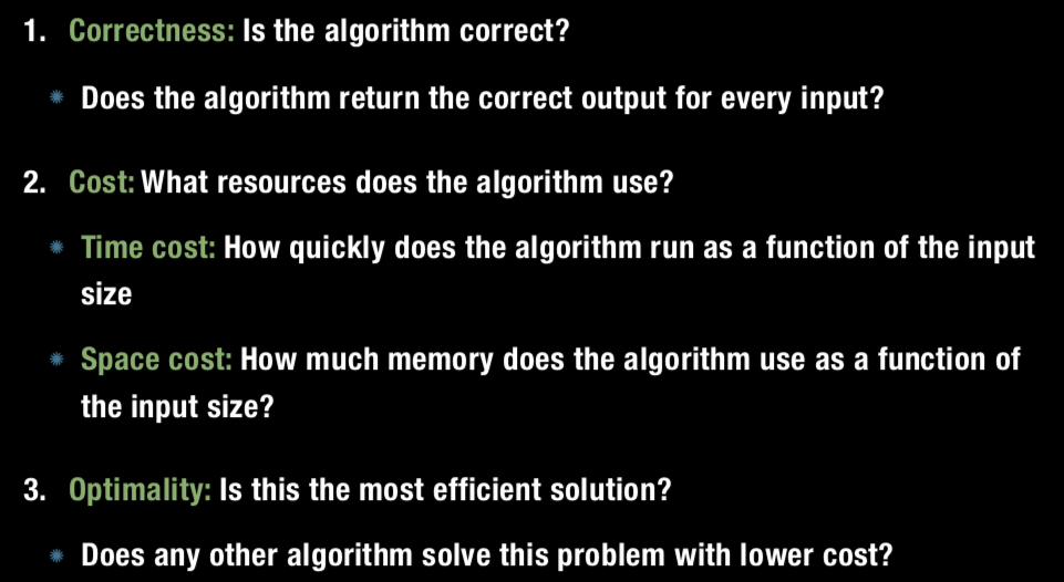 What are 3 types of questions we often ask about an algorithm?