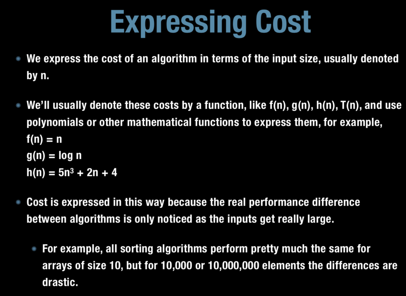In general, how do we express the cost of an algorithm in terms of the input size?
