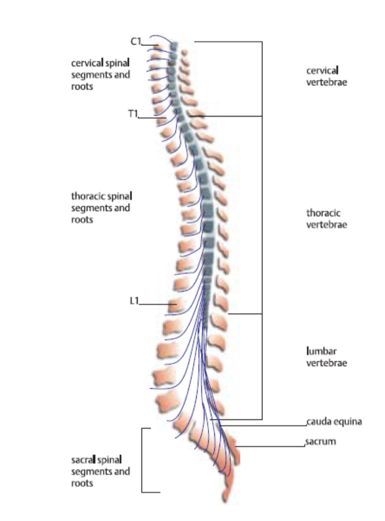 Cervical, thoracic/dorsal, lumbar, sacral (conus medullaris-roots that go down).