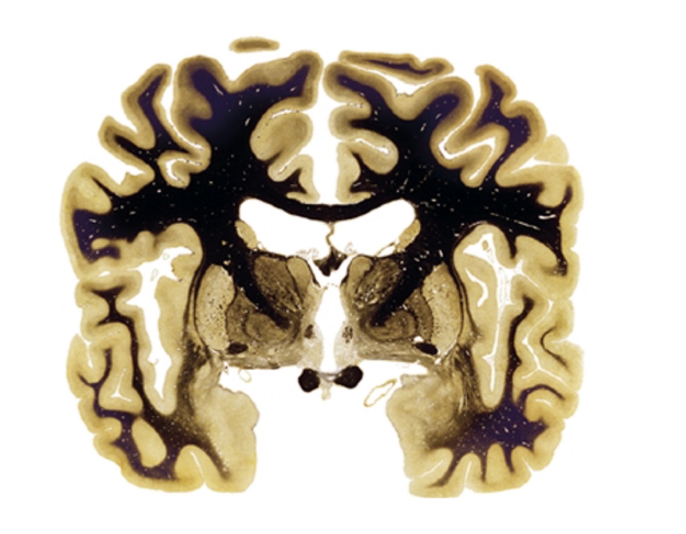 In some images, which are not fresh and are stained, white matter appears as…