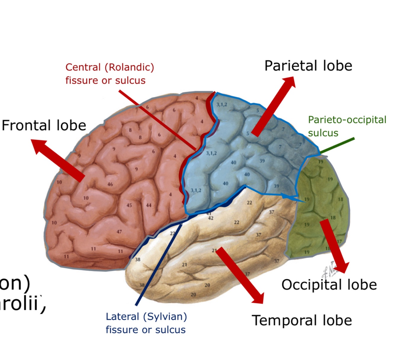 Within the cortex: frontal, parietal, temporal and occipital lobes divided by fissures (sulcus)