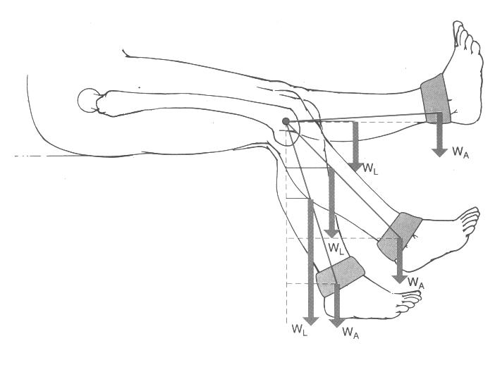 In the figure above, given that the distance from the axis of rotation of the knee to the ankle is 0.45 m, calculate the moment produced by an ankle weight (100N) when the leg is: Why would the actual moment be greater than your calculated figure?
