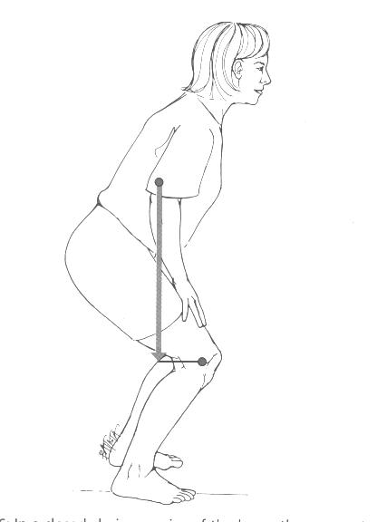 In the figure above, the mass of the body above the knees is 50 kg. If the length of the leg is 0.45 m, calculate the knee flexor moment produced by upper body weight when the leg is: VERTICAL