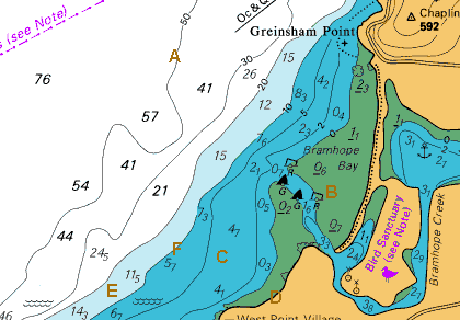 These areas, known as ‘drying areas’, are coloured green on the chart and are situated between the 0m contour and the buff coloured land area