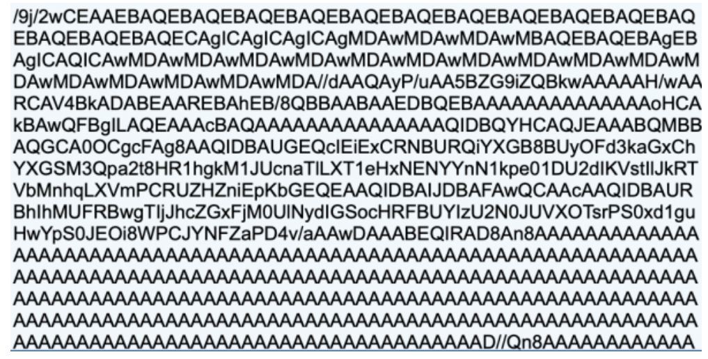 We can use online tools to encode this into a Base64 string. Below is a screenshot of a portion of the Base64 string that was generated. We’re able to send this to someone, and they can reassemble it back into the original image.