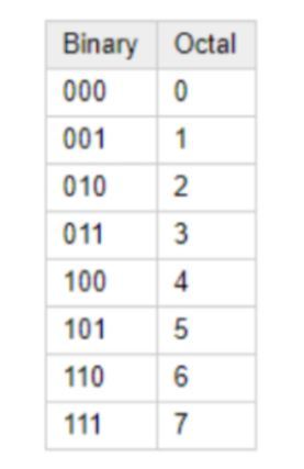 The below conversion table between Binary and Octal can help us to convert long Binary values to shorter Octal values.
