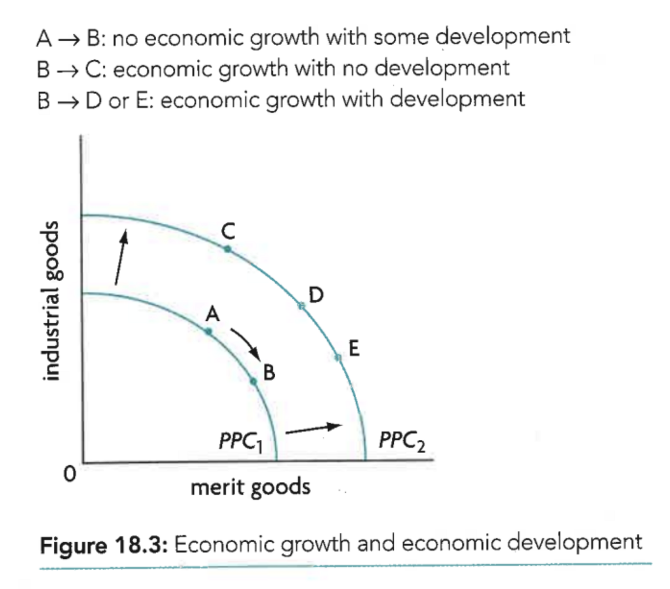 Using appropriate diagrams, explain how it is possible to have both economic growth and development and how it is possible to have just economic growth without development.
