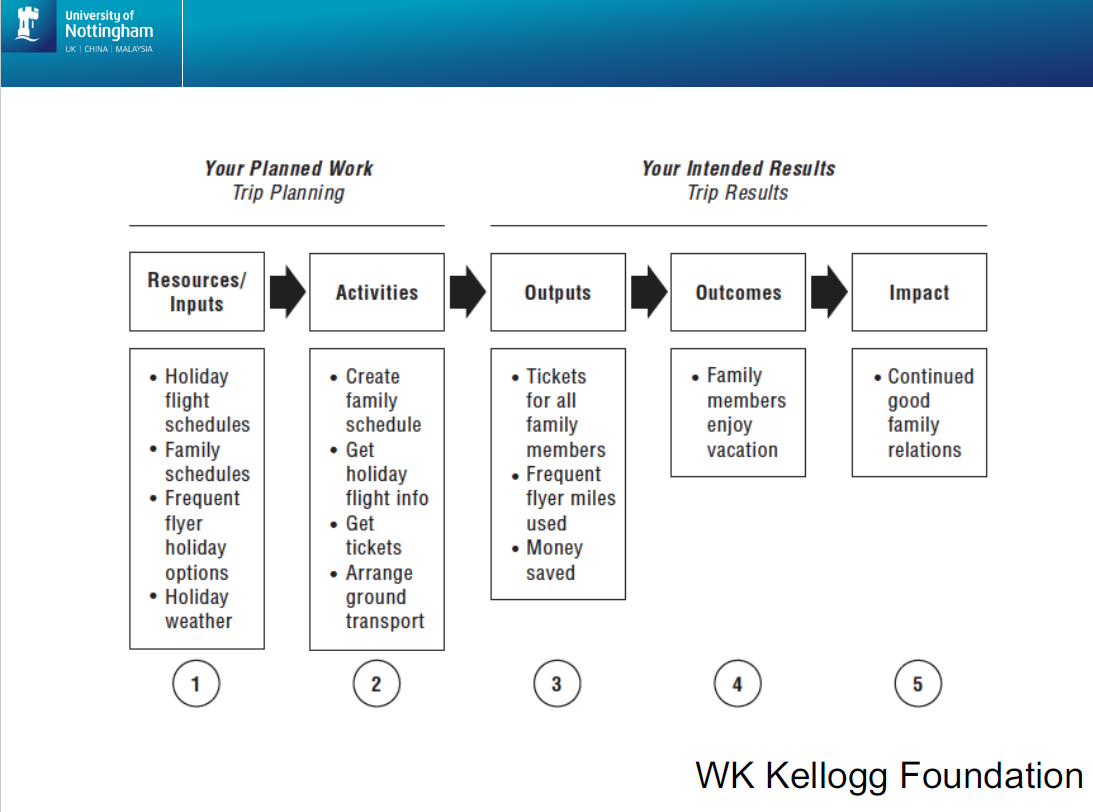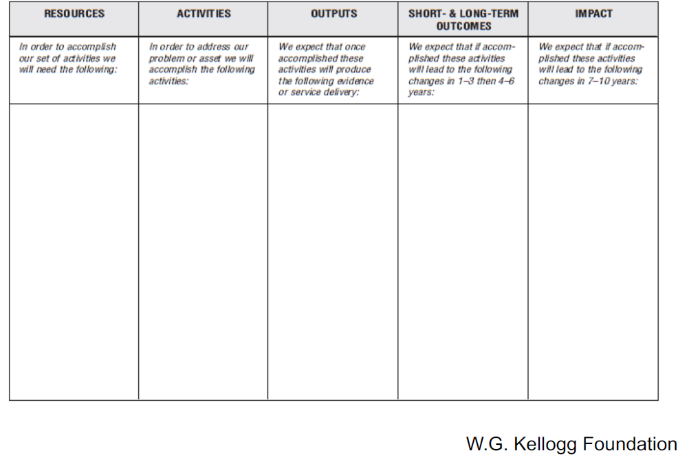 “…a logic model is a systematic and visual way to present and share your understanding of the relationships among the resources you have to operate your programme, the activities you plan, and the changes or results you hope to achieve.“