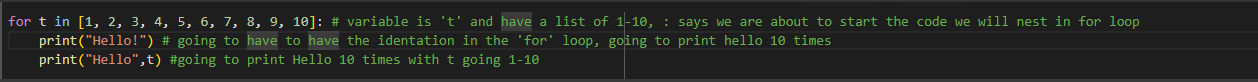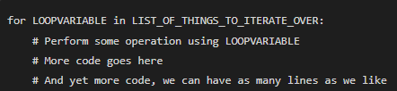 What this means is that LOOPVARIABLE (which can be named whatever you want) will be set to the first item in LIST_OF_THINGS_TO_ITERATE_OVER. The code which is indented (just a comment in this case) will then run.