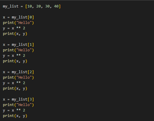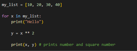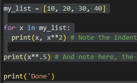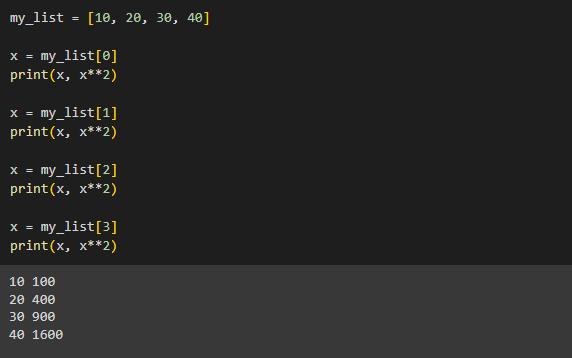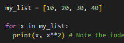 print(x,x**2) is idented within for loop so we print each element in a list followed by itself squared: